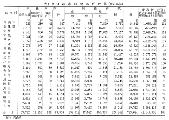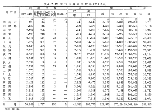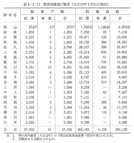 前述の岡山県内務部(大正12年)の「岡山県産業調査書(現況の部)」によれば,当時の養鶏についておおむね次のような判定を下している。すなわち本県の養鶏は,5万7,831戸,26万2,965羽であるが主として副業経営であって,本業は僅かに61戸に過ぎず,1戸平均飼養羽数は4.6羽余りである。地域的分布状況を見れば,浅口,邑久,児島,小田,和気,上道の南部諸郡に盛んで,北部には比較的少ない。その理由は,南部は交通運輸が開けていて,消費地と密接につながり,鶏卵等の集散に商業的有利性を占めていることと,一方,耕作反別が広大であって,これから得られる農産副製造物が多く,かつ,これを利用する家畜の飼養が少ないので,養鶏に潤沢な飼料を供給することができることによる。南部の養鶏は,古くから阪神地方において備中玉(備前産のものもこの名称で移出される)と称して名声を持ち続けている。北部においては,地理的条件から,鶏卵の共販がうまく行かないで,おおむね自給自足の状況にあり,また,農産副製造物の多くは家畜用に利用せられ,産物の集散消費も南部のような調子に行かないことによるものである。」と。