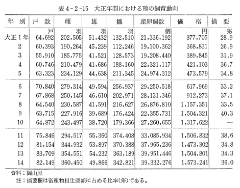 大正年代の岡山県の養鶏は,副業養鶏の域を出ていなかった。岡山県(昭和13年)の『岡山県郡治史』(下巻)によると,「本県の副業は,気候と,天恵の耕地の狭少と,進取的な県民性と,当局の指導奨励によって県南地域は全国有数の産地となった。副業の種類は非常に多く,其の数は200余種である」と書かれており,この中に養鶏も入っていた。