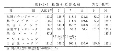 その後,明治42年(1909)には,新たに褐色レグホーン,オーピントン,黒色ミノルカを,44年(1911)には淡色エーコクを,さらに大正4年(1915)には名古屋コーチンを導入し,その生産した種卵は県内の希望者に配布した。その年次別数量は表4−3−2のとおりである。当時飼育されたこれらの導入種鶏の産卵能力は,昭和20年代以降の実用鶏と対比するとかなり劣っているが,単冠白色レグホーン,褐色レグホーン,名古屋コーチンなどは,当時としてはむしろ好成績であったことがうかがえる。