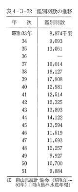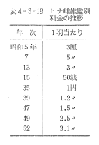 鑑別さきの斡旋,鑑別羽数の割当て,鑑別料金の調整などは,中国支部の結成後は中国支部が行なうようになったが,昭和19年(1944)から同22年(1947)までは,県農業会がこれを行なっていた。鑑別料金の推移は,関係者からのきき取りによれば表4−3−19のとおりである。