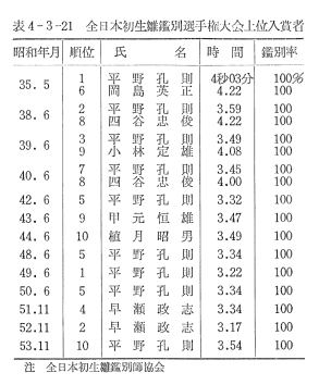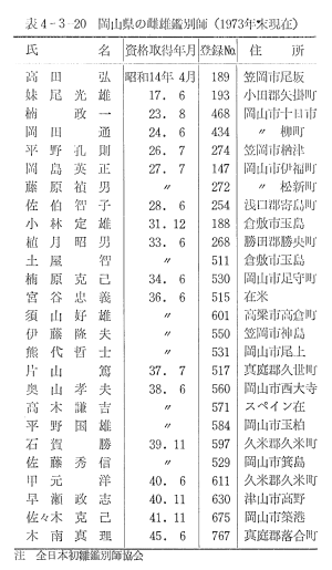 第二次世界大戦の終戦前後活躍した鑑別師の多くは,すでに引退しているが,現在もなお,後進の指導や鑑別の実務に活躍している鑑別師は,表4−3−20のとおり26名となっている。このうち,楠原克己(岡山市)は,一時チックテスターを用いて機械鑑別を行ったことがあったが,その後肛門鑑別に替わり,現在では全員が肛門鑑別を行なっている。
