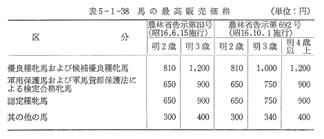 昭和16年(1941),国内馬資源の充実と軍用馬補充の円滑を図るため,価格統制令第7条の規定に基づき馬の最高販売価格が指定された。なお,翌17年(1942)農林省告示第361号(同年6月15日から施行)をもって当歳馬の最高販売価格も450円に指定された。(表5−1−38参照)