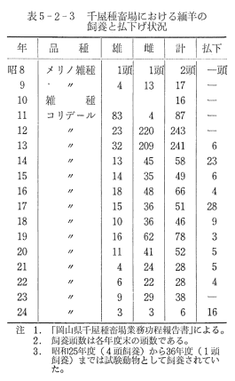 当時県内の緬羊指導は,千屋種畜場(現和牛試験場)を中心として実施されていた。ここに緬羊が飼われたのは,表5−2−3のように昭和8年(1932)メリノ雑種雌雄各1頭が飼育されたのに始まるが,昭和11年(1936)からはコリデール種に統一されている。飼養頭数が最大になったのは昭和12,3年(1937〜38)ごろ240頭余り繋養されたときであった。種緬羊の払下げについては表5−2−3のとおり微々たるものであった。ここではまた,羊毛加工についての研究と指導も実施されていて,昭和12年(1937)ホームスパンが織られるようになっていた。当時農家では簡易紡毛器やハンドカードなどによって,羊毛を紡ぎ毛糸をつくって,自家用に供していた時代であった。