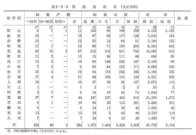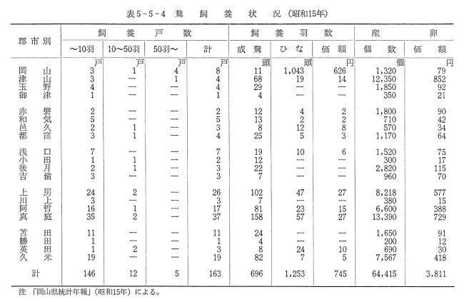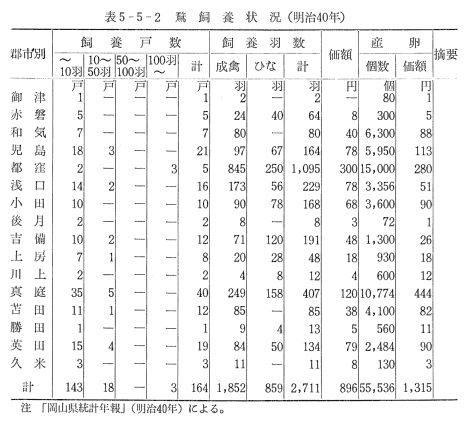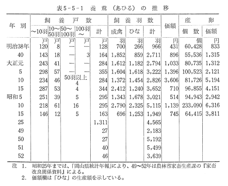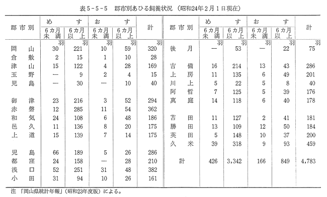 古くは,家畜家禽と呼ぶとき,家禽の中には「鶩」が含まれていたけれども,自給経済の中でひっそり生存していたというのが,養鶩の姿のようである。事実,養鶩に関する資料は皆無と言ってよく,僅かに岡山県統計年報に,明治38年(1905)から見られる程度である。そして,最近になっては,農林省家畜生産課の資料があるので,これらにより,養鶩の推移と,各年代における地域的な飼養状況を表によって示すことにより,その歴史をたどるよすがとする。