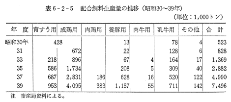 昭和30年代になると,国民生活も安定し,食生活の高度化に伴い畜産物の需要は著しく伸び,これを支える配合飼料の生産量は急激に増大した。なお,昭和29年(1954)には「酪農振興法」(法律第182号),35年(1960)には「養鶏振興法」(法律第49号),36年には「畜産物の価格安定等に関する法律」(法律第183号)が制定され,なおかつ「農業基本法」(法律第127号)が公布されるに及んでこれらに基づく諸施策により,畜産経営の近代化が進み,中でも乳牛,鶏,豚等用畜の飼養頭羽数が著しく増加した。