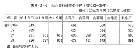 またこの時代の飼料価格は,表6−2−6のとおりで,年度によって多少の差はあるが,概して飼料価格は低位安定の状態が続いた。その理由は前述のように海外における飼料用原料が豊富でその確保が容易であったという恵まれた条件にあり,加えて国内飼料製造業者の企業努力によるところも大きかった。