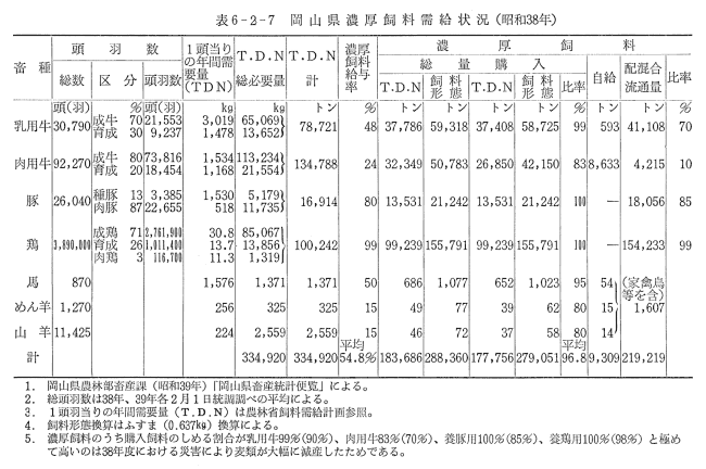 表6−2−7は,この年代における岡山県における濃厚飼料の需給状況を示したものである。