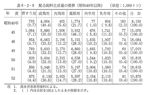 配合飼料の生産量を,畜種別に見ると,採卵鶏用の他,ブロイラー,豚,肉牛等の肉畜用飼料の増大が著しく,採卵鶏用配合飼料は,昭和48年(1973)ごろからやや減少している。これは同年以降配合飼料の価格が大幅に値上りしたため,配合飼料への依存度の高い養鶏経営においては,採算がとりにくくなったためと見られる。