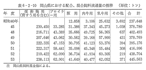 なお,この間の岡山県下における配合飼料の流通量は,表6−2−10のとおりで,全国的な推移と全く同じ傾向を示し,53年(1978)には実に445,563トンに達した。これは中国地区では最高の流通量となっている。