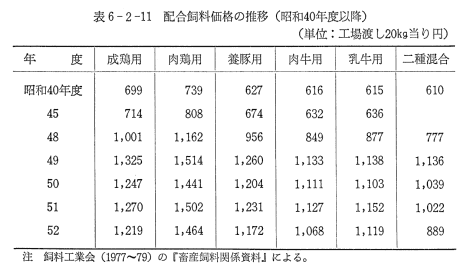 つぎに,配合飼料の価格については,表6−2−11のとおり,年により多少の変動はあったものの,40年代前半は大体低位安定状態で経過したが,47年(1972)から48年(1973)にかけてソ連ならびに中国が大量の穀物買付けを行なったため,飼料原料を含めて世界の食糧需給状態は逼迫して価格が急激に高騰した。また,時を同じくして起こった石油危機により,一挙に大幅な値上げが行なわれ,畜産経営は危機に陥ったのである。