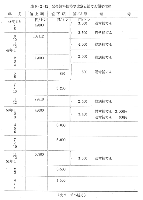 昭和48年(1973)3月以降における飼料価格の改定ならびにこれに伴う補てん実績は,表6−2−12のとおりである。