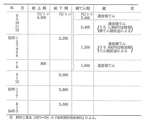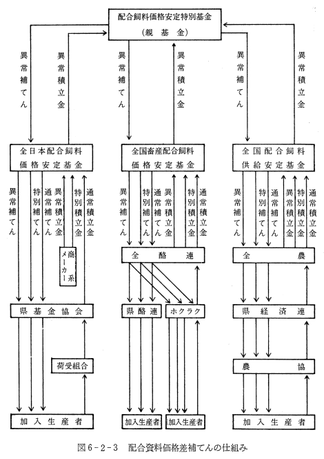 (3)全農および全酪連系の配合飼料価格安定基金による飼料価格差補てんを実施させるとともに,商系配合飼料価格安定基金設立を促進し,これらの3基金の補てんが円滑に実施できるように出資および助成を行なった。