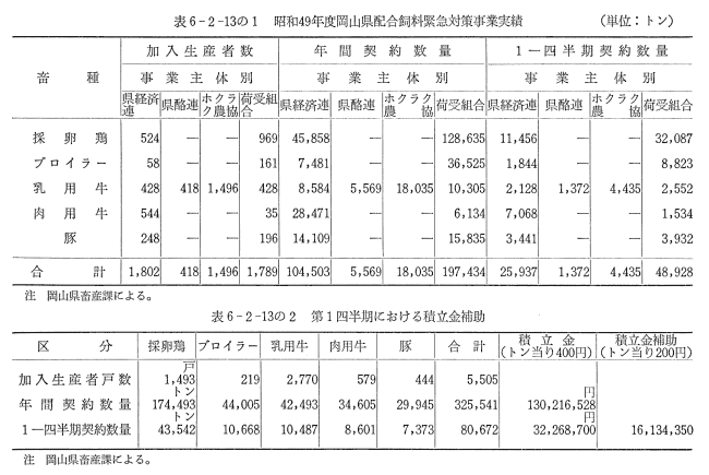 なお,岡山県においては,この飼料危機に対処し,昭和49年度配合飼料緊急対策事業として,飼料安定基金に加入している生産者に対して,第1四半期における通常積立金(トン当たり400円)の半額を補助して,畜産農家の負担を軽減した。その実績は表6−2−13のとおりである。