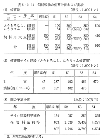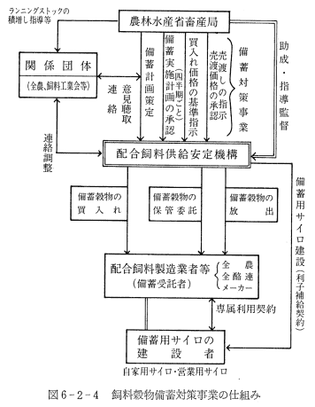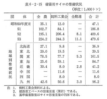 なおこの飼料穀物備蓄対策事業の仕組みの概要は,図6−2−4のとおりであり,備蓄計画およびその実績は表6−2−14のとおりである。また,備蓄用サイロの整備状況は,表6−2−15のとおりである。