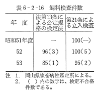 検査は,国の委託事業として,知事がこれを受託し,岡山県の場合は家畜病性鑑定所が指定検査機関として,これを実施している。検査は,法第13条による公定規格の検定事業と,法第21条による立入検査とがあって,事業開始以来の各年度における検査件数は表6−2−16のとおりである。検査の結果は,公定規格によるものについては,検定を受けた工場に直接通知し,一方立入検査については,検査終了後そのつど県公報に公表している。