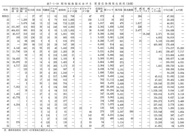 戦後の混乱期から現在(1977)に至るまでの家畜伝染病の発生状況を全国的に総括すると,幸いなことに,牛疫,牛肺疫,口蹄疫など悪疫の侵入はなかった。しかし,昭和20年代には牛の流行性感冒,馬,豚の流行性脳炎,馬の伝染性貧血,豚コレラ,豚丹毒の流行が見られ,家禽にはアメリカ型のニューカッスル病が進駐軍の残飯を感染経路として侵入し,狂犬病も再度流行の兆が見えている。その他,牛の結核病,ブルセラ病,ひな白痢など多種多様な伝染病が続発し,家畜衛生組織の再建整備がいそがれている。次いで,昭和30年代には畜産振興の波にのって増頭された家畜に,引き続き前記の諸疾病が発生まん延して多大の損害を与えた。特に40年代に入ると,畜産経営の規模拡大と著しい畜産振興に伴い,主として密飼い化した中小家畜を豚コレラ,豚丹毒,鶏のニューカッスル病,密蜂のふそ病等が襲い,各地に大流行が見られた。表7−1−10に示したように,豚コレラは昭和41〜43年(1966−68)の3年間,豚丹毒も昭和41〜42年(1966−67)に大流行し,特に,鶏のニューカッスル病は,昭和40年(1965)から病勢の強いアジア型が侵入して,昭和43年(1968)まで全国各地に大発生して,養鶏界を恐怖のどん底に陥し入れたことは記憶に新しく,昭和42年(1967)には実に1,938,100羽の鶏が犠牲になり,1羽も残さず全滅した養鶏家も多かった。このように,多頭羽飼育で密飼い化した畜産経営に伴って増大した家畜伝染病に対処するため,昭和43年(1968)ごろから自衛防疫の必要性が強く叫ばれ,昭和46年(1971)6月には,家畜伝染病予防法の一部改正が行われ,第62条の2により予防のための自主的措置が明文化された。そして,このための組織として家畜畜産物衛生指導協会が各都道府県段階に設置され,自衛防疫を強力に推進することになり,国県の行う家畜防疫の一翼を担って大きな力を発揮している。