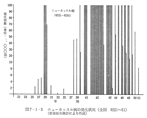 本病は,戦前には家禽ペストと呼ばれたもので,昭和5−6年(1930−31),関東地区を中心に約20万羽の発生があり,終戦ごろまで散発していたが,戦後しばらくは発生がなかった。しかし,昭和26年(1951)に至り,埼玉県下に進駐軍の冷凍肉の残飯に端を発したと考えられるアメリカ型の発生がみられ,同年には埼玉のほか東京,神奈川,栃木,茨城,岡山の都県に散発的に発生し,約2万羽の病鶏を数えた。その後のおもな発生は,昭和29年(1954)の大阪府を中心とする大発生で,約47万羽の被害があり,昭和39年(1964)までは,1〜2年おきに局地的な小流行が繰り返されていた。ところが,昭和40年(1965)春から,神奈川県相模原養鶏団地に大発生がみられ,次いで,夏期には大分県に病勢の強いアジア型のニューカッスル病が爆発的に発生した。そして,これらを起点として同年暮れから翌年にかけて九州一帯,愛知,静岡,関東地区にまん延し,さらに,昭和42年(1967)には全国的に飛火して,41都道府県に広がり,養鶏界を恐怖のどん底に陥しいれた。アジア型は,病勢が強く,致死率も100%に近いので,全滅した養鶏場も枚挙にいとまがなく,前記の発生数は,統計上190万羽以上に達し,いまだかつてない大惨事であった。この惨害をめぐって,本病予防のために生ワクチンの早期応用を要望する養鶏業者と,慎重論の農林省当局が,するどく対立して激論をたたかわしたのも記憶に新しいことである。その結果,昭和43年(1968)秋ごろから生ワクチンが全面的に応用され,予防接種の励行と,官民一体の防疫措置が奏効してようやく下火となり,昭和44年(1969)以降は平静化して,最近では局所的にごく少数の散発がある程度で推移している。